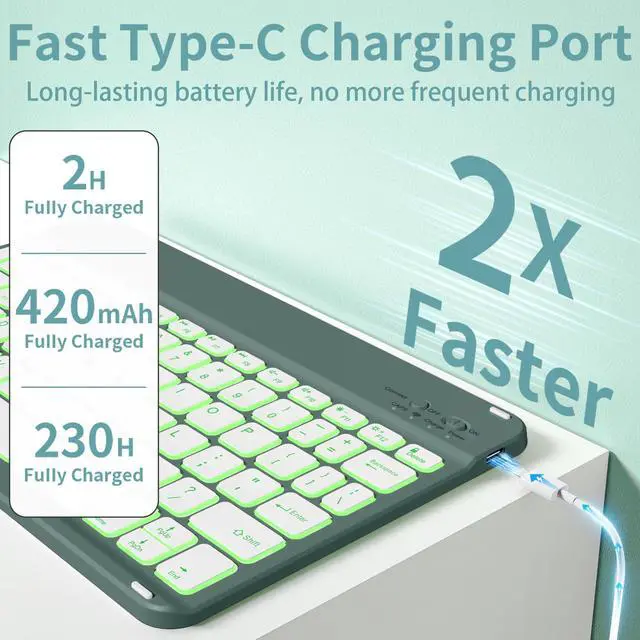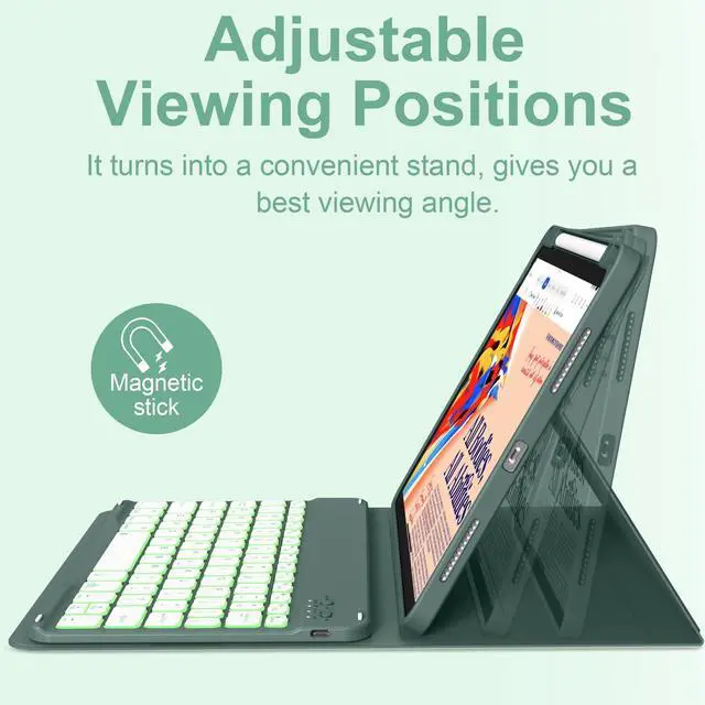 • 7-color Backlight KeyboardThis iPad air 7th/6th/5th/4th Generation keyboard case has 3 levels of 7 colors backlighting, adjustable different brightness levels and preferred backlighting color, the light can enhance the visibility of the keys in low-light environments, provide users with beautiful visual enjoyment, and allow users to type on the keyboard more easily