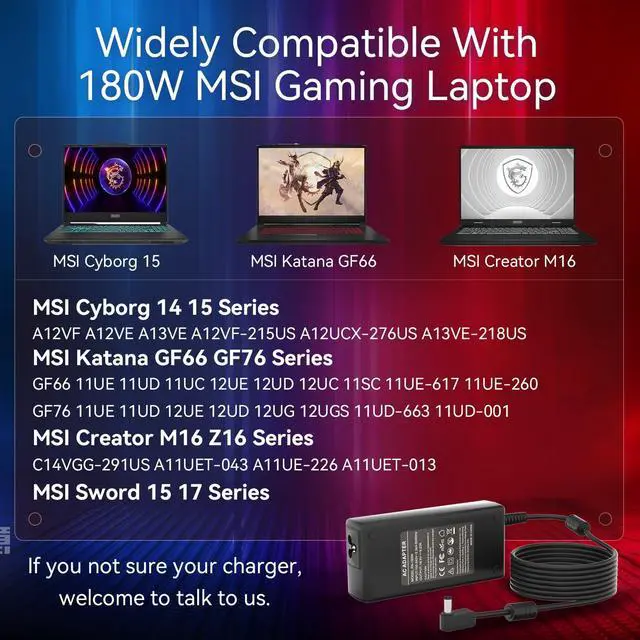 FOR MSI GAMING LAPTOP CHARGERThe output parameter of our laptop charger is 20V 9A 180W, compatible with 20V 6A 120W power supply for msi gaming laptop, the interface size of the product is 4.5X 3.0 mm. (Please refer to the picture to comfirm your connector size before purchase) ^^ PERFECTLY FOR MSI CYBORG 15 14replacement for msi laptop charger cyborg 14 15 series A12VF A12VE A13VE A12VF-215US A12UCX-276US A13VE-218US ^^ WORK WELL WITH MSI KATANA GF76 GF66Fit for Msi Katana GF66 GF76 GV15 series GF66 GF76 11UE 11UD 12UE 12UD. Compatible with MSI Katana GF66 11UC 12UC 11SC, Katana GF76 12UG 12UGS.