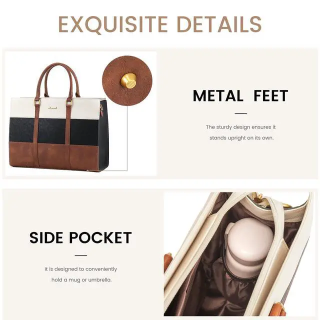 Organized & SpaciousSize: 16.3" x 6"x 12.3". This leather tote bag for women features a separate compartment for a 15.6 -inch laptop and a tablet, 1 large zipper pocket, 2 slip pockets, 2 pen slots, and 1 side pocket, keeping you effortlessly organized all day ^^ Waterproof & DurableCrafted from premium PU leather and high-density nylon lining, this laptop purse is scratch-resistant, waterproof, and easy to clean. Metal feet protect the bottom from wear, while a secure zip-top closure keeps your belongings safe ^^ Easy to UseFeaturing adjustable and detachable shoulder straps from 34 to 52.5 inches, this bag suits women of all heights. Side pockets are perfect for water bottles or umbrellas, making it an ideal work tote, laptop briefcase, or teacher bag ^^ One Bag Fits All Occasions Stylish and sophisticated, this work tote bags for women is perfect for work, business trips, shopping, college, and daily use. It's an ideal choice for Suitable for professional women, students, teachers, and more