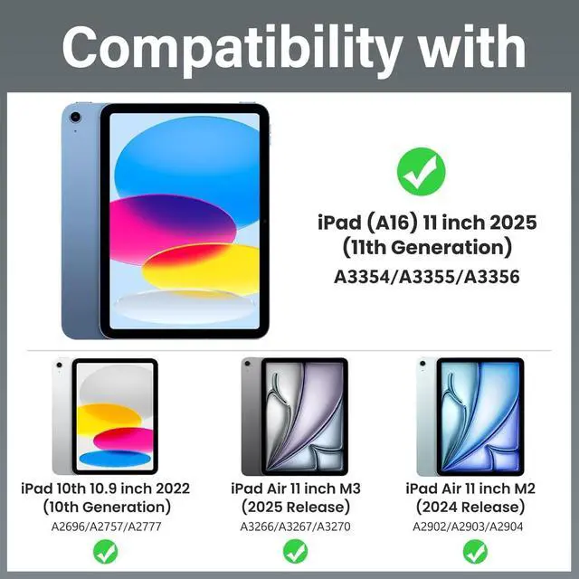 Compatibility Model: Exclusively designed for the iPad 10th Generation & 11th A16 2025 (A2696, A2757, A2777, A3354, A3355, A3356),iPad Air 11-inch (M3) 2025 (Model: A3266 / A3267 / A3270), iPad Air 11-inch (M2) 2024 (Model: A2902 / A2903 / A2904) , Please check your iPad model before purchasing.