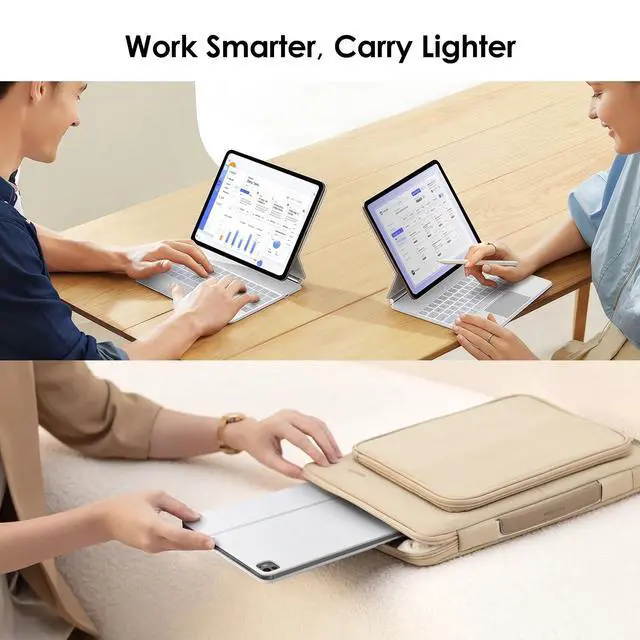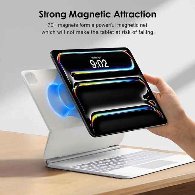 Easy-Set Magnetic Stand: you can attach your iPad to the back cover magnetically, Set the floating cantilever stand with one smooth motion, and transform your iPad turn your tablet into a highly performant and easy-to-use laptop within a second! Which is perfect for traveling, business, and school.