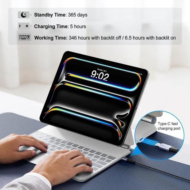 ^^ Fast Charging Method: The 750mAh battery and ultra-efficient design let you work longer on a single charge. Work daily for 3 months or nightly for 2 weeks on a single charge then recharge quickly with convenient USB-C charging. The keyboard case also comes with a backlight. The 3 brightness levels let you work comfortably at any time of day.