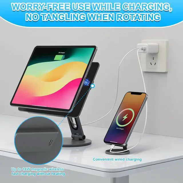 2-IN-1 MAGNETIC DESK STAND COMBOThis combo includes a magnetic ipad charging stand for iPad Pro 13" M4/M5 and a separate folding magnetic phone holder, creating a complete, space-saving setup that maximizes productivity and organization ^^ SUPER STRONG MAGNET & UNIVERSAL COMPATIBILITY Engineered with powerful N55 magnets, this stand securely holds your iPad Pro 13" M4/M5 (2024/2025) with up to 22 lbs of support, and equipped with a metal rod to support other iPad models. The phone holder offers strong magnetic force for MagSafe iPhones 12-17/Cases, and includes metal rings for non-MagSafe models, ensuring broad compatibility ^^ 18W FAST WIRELESS CHARGING Enjoy the convenience of cable-free power.