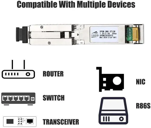 2.5G ONUSFP XPON STICK+ Media Converter= 2.5G XPON ONU Connect EPON OLT, it is 1.25G EPON ONU; Connect GPON OLT, it will be like a 2.5G GPON ONU ^^ Maximum Transmission DistanceThe maximum distance between the ONU and the OLT is 20 km, and the distance between the network cable and your route is 100 meter. ^^ OLT CompatibilityThe ONU is compatible with mainstream GPON/EPON OLT brands in the market. Generally, the OLT can be automatically registered, depending on the functions of the OLT. ^^ Easy to UseSupport MAC/SN/LOID Modify, You can copy the content from the old ONU to the new one through the web management.