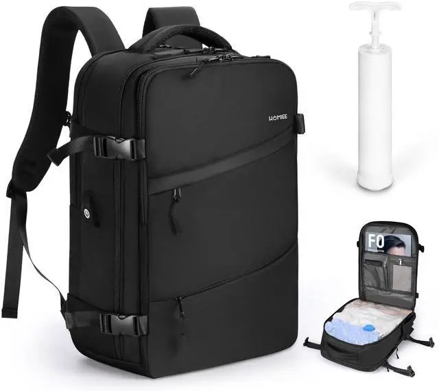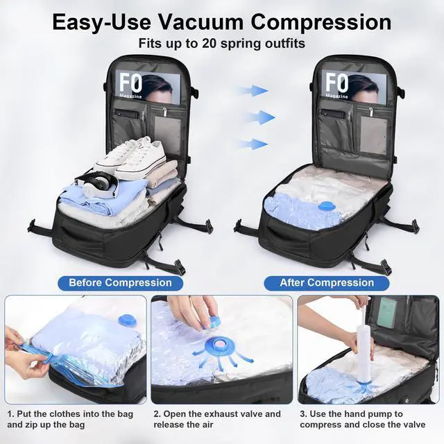 Travel Backpack with Storage Bag and Hand Pump - This backpack comes with a vacuum compression bag and manual air pump, which can compress multiple pieces of clothing to save space. The airtight seal design can keep items compact for several days, making it ideal for short business trips or travel ^^