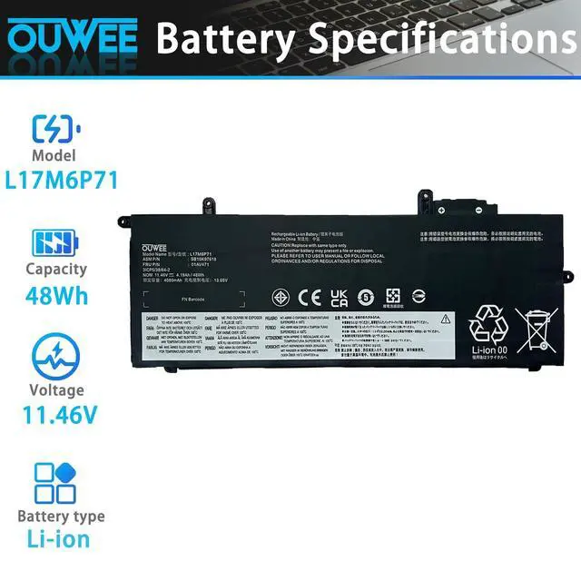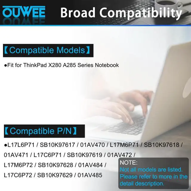Capacity: 48Wh 4.19A h. ^^ Compatible Part NumberL17L6P71 SB10K97617 01AV470 L17M6P71 SB10K97618 01AV471 L17C6P71 SB10K97619 01AV472 L17M6P72 SB10K97628 01AV484 L17C6P72 SB10K97629 01AV485. ^^ Replacement For LaptopLenovo ThinkPad X280 A285 Series Notebook. ^^ CertificateAll OUWEE products are Certified by CE, FCC for safety. Strict guidelines for compatibility, and standards compliance for environment safety. ^^ OUWEE Worry-Free Warranty ServiceRest assured with 30 days Refund and 12 months Replacement, also get our friendly customer service.