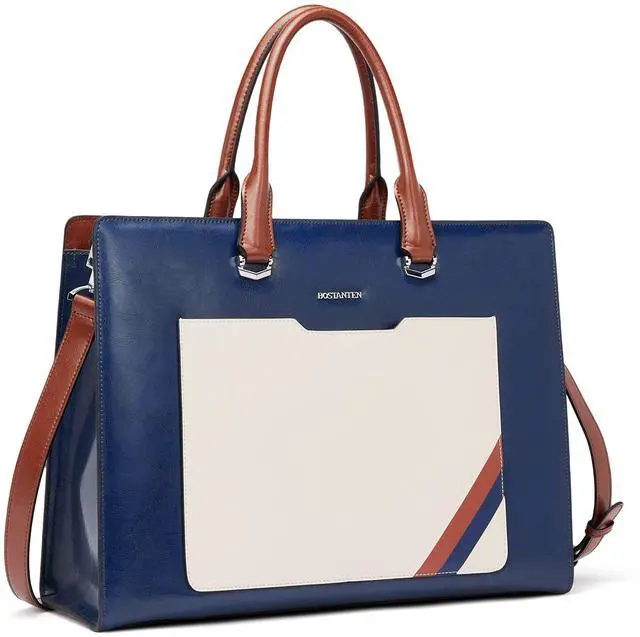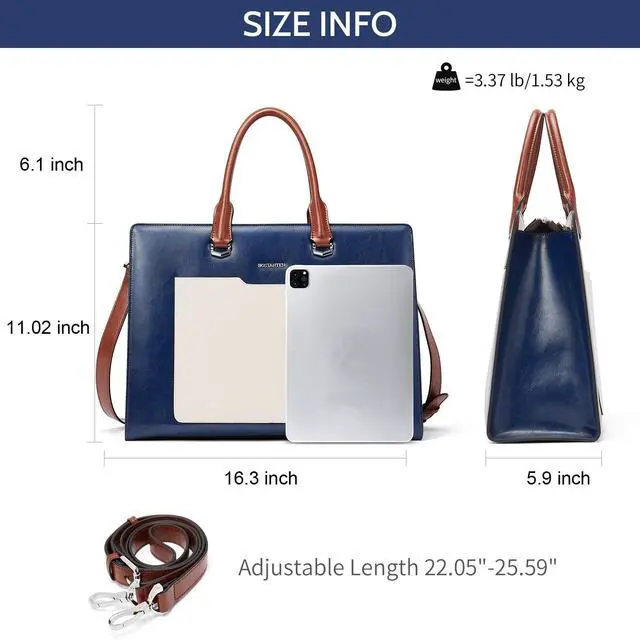 Handle: 6.1 inch. The computer bag comes with an adjustable detachable strap ( 22.05 - 25.59 inches) which can adjust to fit your height. ^^ STRUCTURE -- The Laptop bag is divided into three sections. 1 main compartment for your A4 documents, 1 laptop padded compartment suitable for a 15.6 -inch laptop. 1 inner zipper pocket for your ID card, key, phone. 2 slip pockets, 2 pen loops, 1 external zip pocket, 1 front pocket. Roomy enough to carry a lot of daily stuff such as laptop, iPad, wallet, phone, umbrella, cosmetic, etc. Lots of pockets and sections inside to organize everything. ^^ STYLISH LAPTOP BAGS FOR WOMEN -- Blue with white color looks more luxurious, highlight your elegance. The laptop briefcase has 1 adjustable detachable strap which can be used as a shoulder bag, business briefcase, handbag. Fashion design suitable for all lady uses when working, traveling, shopping. ^^ IDEAL GIFT -- Whether you want to give a stylish and practical gift for your mom, sister, girlfriend, or wife to show your care and love, this laptop tote bag is a surprising choice.