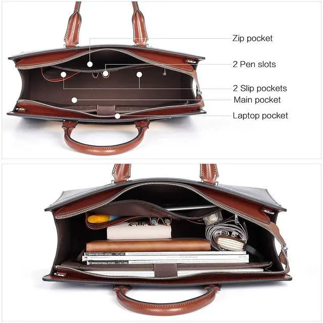 LEATHER LAPTOP BAG -- The Briefcase is made of genuine leather and fabric lining, handmade by professional craftsman, well made and stylish. With durable silver hardware, the zipper is smooth enough that easy to open and close zips. ^^ 15.6 INCH COMPUTER WORK BAG -- The dimension of the leather laptop is 16.3 (L) x 11.02 (H) X 5.9 (W) inch, suitable for a macbook or other 15.6 -inch laptop.