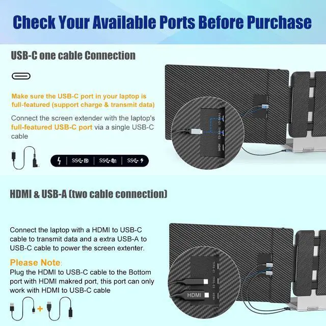 Please Note: when use the HDMI cable, please connect one extra USB-A to USB-C cable to the same screen extender to power supply. ^^ Multiple Display Mode & 180RotationThis second screen for laptop portable provides multiple display modes [Mirror mode/extension mode/landsape and portrait mode], attachable monitor for laptop can also 180 rotating allowing you to customize the viewing experience according to your preferences. And share your screen effortlessly with clients or colleagues, enhancing communication efficiency during collaborations. ^^ Wide Compatibility & Reliable ServiceThe monitor extension for laptop portable monitor supports a wide range of devices and operating systems, including Intel, AMD, ARM, Android, Windows, Mac, M1, M2, M3, Chrome, Linux, Type-C phones, PS4, Xbox, Switch, M1 Pro/Max, M2 Pro/Max, and other processors. Sincere and fast customer service at any time to serve you, quickly help you solve the problem.