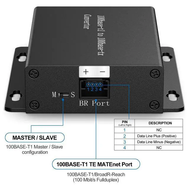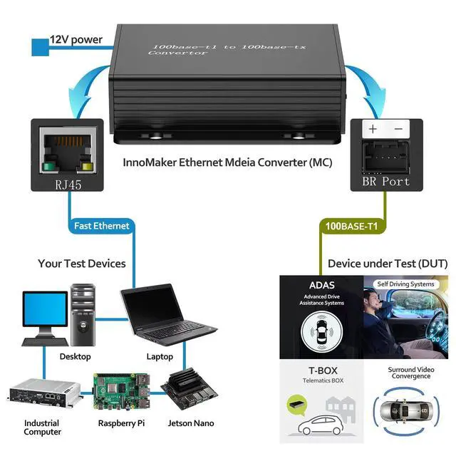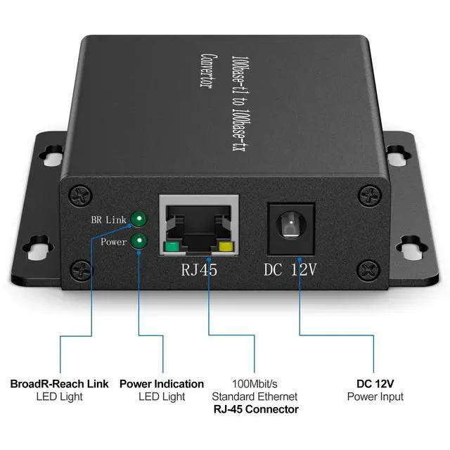 Establishes a direct point-to-point conversion between automotive ECU's using 100BASE-T1/BroadR-Reach(100 Mbit/s Fullduplex, ) and any standard Fast Ethernet (100 Mbit/s, 100BASE-TX) device with an standard ethernet RJ45 connector. ^^ Comes with 1x Unshielded Twisted Pair (UTP) cable and 1x 12V power adapter. ^^ By using the BCM BroadR-Reach PHY BCM89811B1AWMLG, ensure a trustworthy and effective tool to customers that are looking for a cost-efficient, quick and manageable solution for testing requirements, with no latency and no packet loss. ^^ Features with 100BASE-T1 Master / Slave configuration and link LED. ^^ Plug and Play, No need to install the drivers.