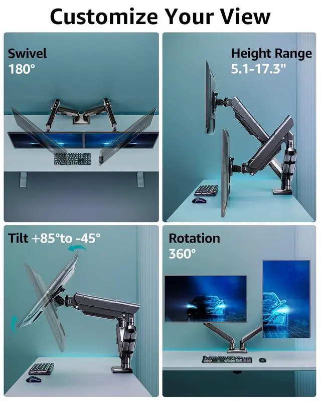Screen Positioning: 360rotation for landscape or portrait orientation, +/-90 swivel for effortless screen sharing, and +85/-45 tilt for the ideal screen angle. This dual monitor stand allows you to effortlessly find the ideal ergonomic posture to boost comfort and productivity when working or playing games, taking you to the next level! ^^