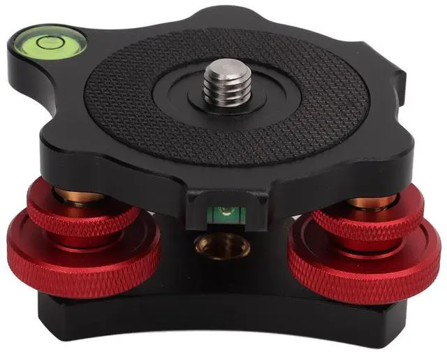 Three Spirit Level Designs ------------------ With three spirit levels, this leveling base allows for multi-directional adjustment and observation of the level. This ensures precision and accuracy when setting up your equipment. ^^ Aluminum Alloy Material ------------------ Made from aluminum alloy, this leveling base undergoes CNC tight processing for a fit. It also features anodic oxidation treatment, making it strong,. ^^ Adjusting Angle ------------------ Each of the three locking rings can be adjusted horizontally, triple wheel bubble level providing a 5 horizontal adjustment range. This allows for precise leveling even in challenging terrains.