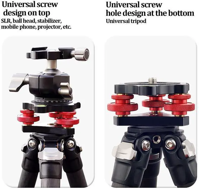 ^^ Three Adjustment Dials ------------------ Equipped with three adjustment dials, this triple wheel bubble level enables the operator to make fine adjustments. This allows for easy leveling of your equipment, ensuring stability and accuracy. ^^ 3/8in Screws at Both Ends ------------------ 64 Leveling Base featuring 3/8in screws at both ends, this Xis compatible with most tripods. Additionally, the 3/8in screws on the top can be used with various SLR ball heads, providing versatility in setup options.