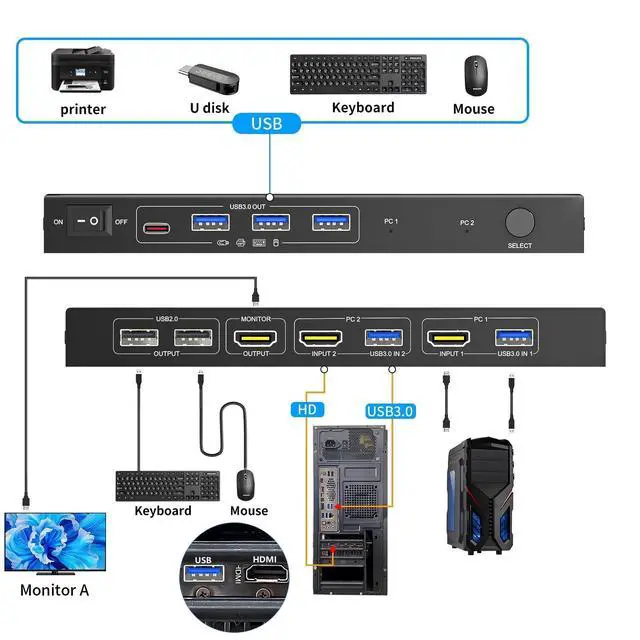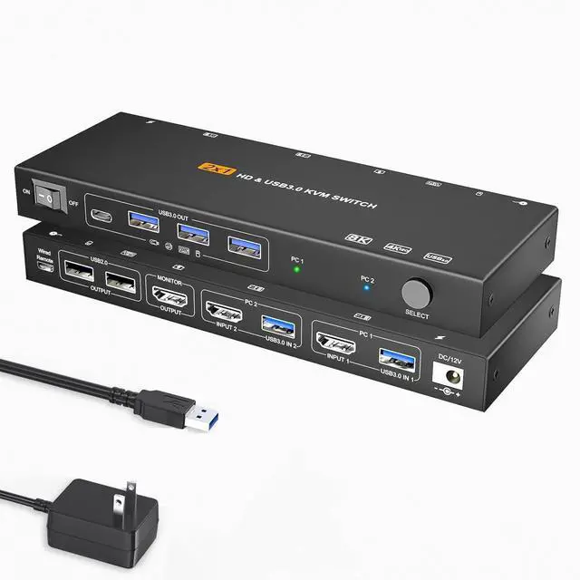 Note: KVM requires a high-quality HDMI 2.0 standard cable no longer than 3.3 feet in length, and ensure that your computer and monitor support 8K to ensure the transmission of video signals! ^^ 4 USB 3.0 portsKVM switches features 4 USB 3.0 and 2 USB 2.0 ports for ultra-fast data transfer speeds of up to 5Gbps. It allows you to seamlessly share peripherals like printers and external drives between two computers, reducing clutter and enhancing efficiency. Ideal for sharing USB devices such as keyboards, mice, scanners, printers, and flash drives, this switch automatically detects and matches connected devicesNOTE: Keyboard and mouse connected to the black USB 2.0 port ^^ Broad Compatibility & 2 Switching MethodsUSB 3.0 HDMI KVM Switch is compatible with a wide range of operating systems including Windows (11/10/8/Vista/XP etc. ), Mac OS, and Linux. It also works effortlessly with major HDMI devices such as PS5/4, mini 4 Pro, Xbox One, and PC, allowing easy switching between computers with a physical button or wired remote, LED indicate the active computer