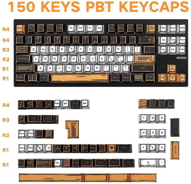 Durable PBT MaterialMade from premium PBT plastic, these keycaps resist wear, fading, and shine over time. Unlike softer materials, PBT maintains crisp legends and vibrant colors, ensuring lasting performance and style. ^^ Universal CompatibilityThis keycap set includes 150 keys with a 6.25 u spacebar and 1 keycap puller, fit most 60%/65%/75%/80%/96%/100% (61/64/68/75/84/87/96/104/108) US layout mechanical keyboard ^^ Cherry Profile The pbt keycap set designed with the classic Cherry profile, engineered for the ultimate typing experience. You won't get tired even if you use it for a long time at work or gaming.
