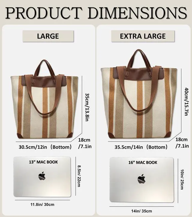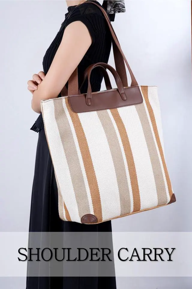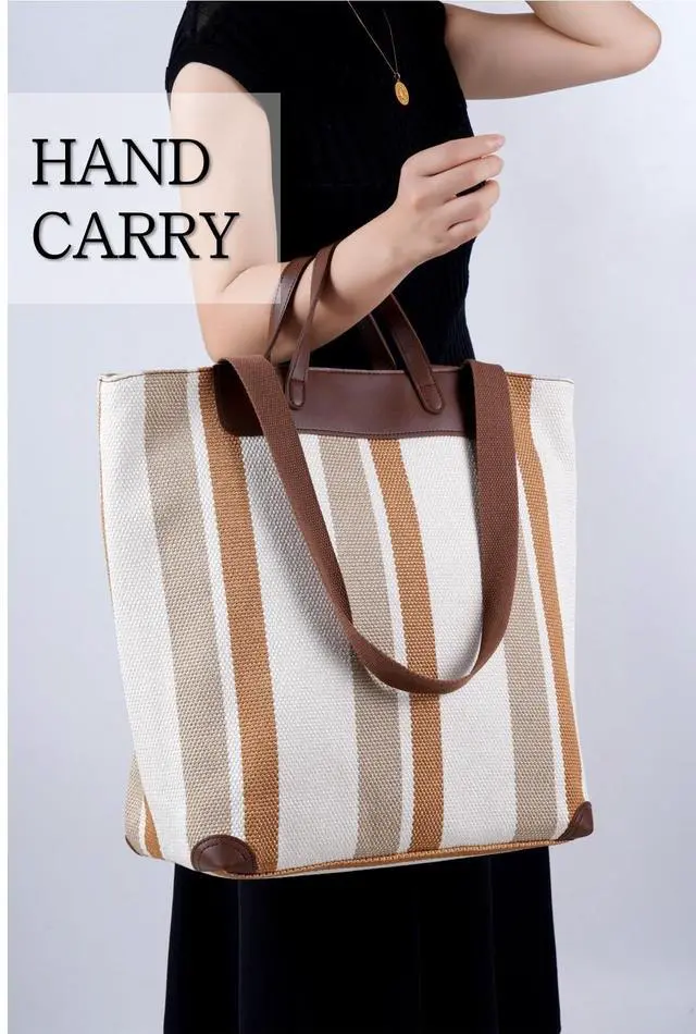 Effortless organization for easier travel. ^^ Premium Materials, Durable and Stylish The bags exterior is made of special canvas fabric with PU leather accents. The canvas is highly durable and wear-resistant, offering features like water resistance, easy cleaning, and eco-friendliness. The interior is lined with thick cotton fabric, with dense stitching and a soft feel. The durable and smooth zipper enhances the user experience, ensuring effortless opening and closing. ^^ Stylish Color-Block Design, Simple Yet Vibrant This color-block striped tote bag features bold color combinations and a minimalist striped design, adding a modern and lively touch to your style.