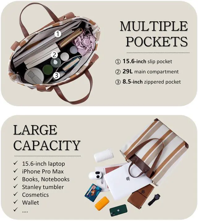 Perfect Work Bag Design This bag offers ample space for a laptop, folders, and office essentials, meeting all your work needs. Its multifunctional design includes a comfortable PU handle and a thickened canvas shoulder strap, allowing both handheld and shoulder-carrying options, ideal for commutes and office use. The stylish color-block design and durable materials ensure a professional yet fashionable look, making it perfect for daily work life. ^^ Spacious & Well-Organized 24L Capacity with 3 Pockets Measures 39cm 18cm 35cm, offering ample space for daily essentials. The 13-inch inner pocket holds a laptop and iPad, the zippered main compartment fits a water bottle, umbrella, documents, cosmetics, and more, while the 8.5 -inch zippered inner pocket securely stores a phone, wallet, and other valuables.