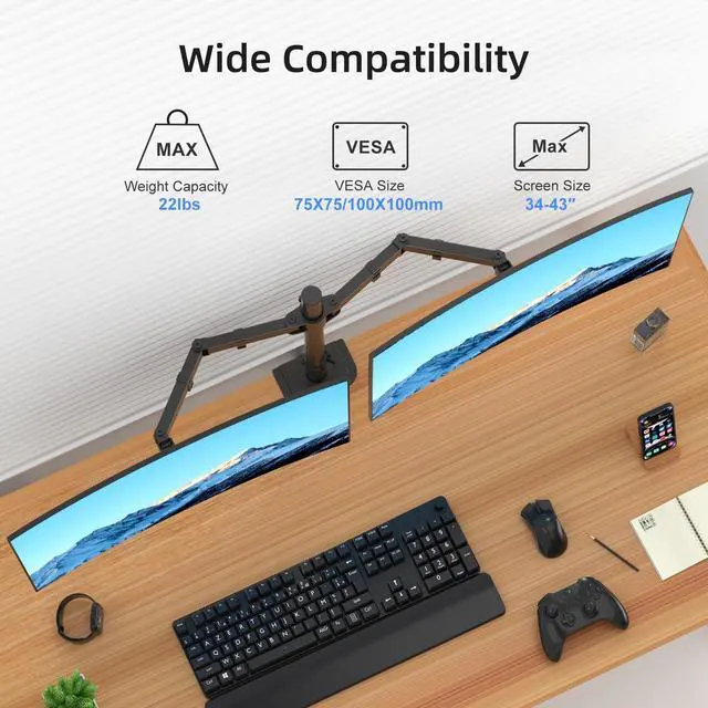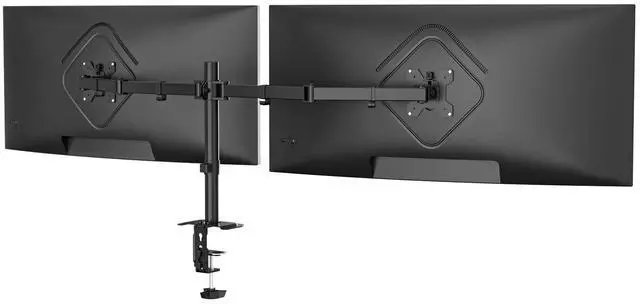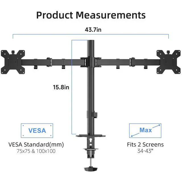Compatibility - Dual monitor arm desk mount ideal for most screens up to 43" and 22lbs each with 75x75mm or 100x100mm backside mounting holes. ^^ Fully aticulation - Rotate 360, tilt 90 up and down, swivel 90 left and right, height adjustment along the center pole. ^^ Two install options - C-clamp and optional grommet base (fits desk up to 4" thickness) save your valuable desk space. ^^ Integrated cable management - Keeps your desk tidy and clean by organizing your power and AV cables in detachable cable clips. ^^ Easy installtion - Step-by-step user manual and organized hardware kit for hassle free mounting.