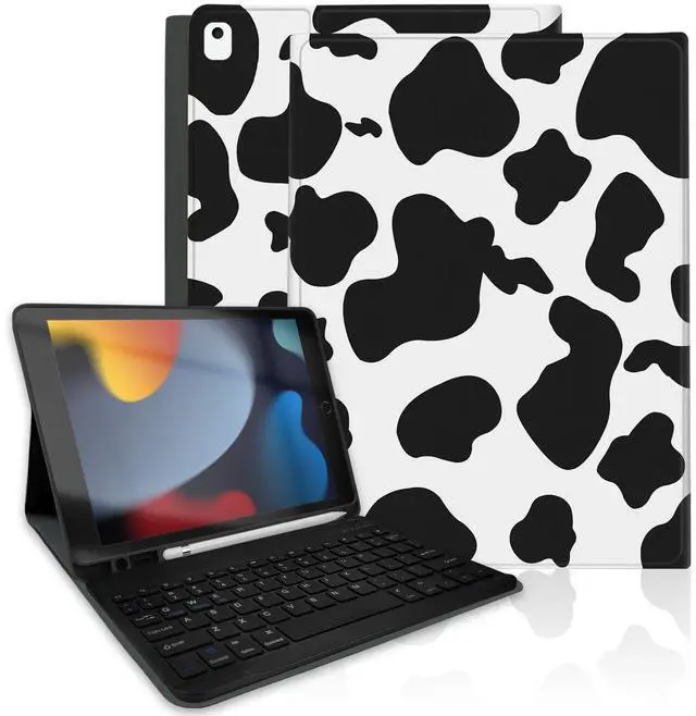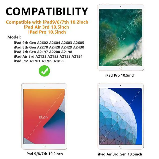 [iPad Keyboard Case Compatibility] This iPad keyboard case is designed for 10.2 inch iPad 9th generation 2021 (A2602/A2604/A2603/A2605), iPad 8th generation 2020 (A2270/A2428/A2429/A2430), iPad 7th generation 2019 (A2197/A2200/A2198), iPad Air 3rd generation (A2123/A2152/A2153/A2154) 10.5 inch, iPad Pro (A1701/A1709/A1852) 10.5 inch. Please check the model number on the back of your iPad before purchasing. ^^ [Pencil Holder and Multi-angle Adjustable Support] This iPad tablet case has a built-in Pencil holder that makes it easy to carry Pencil and removal. The iPad case has three notches that can be used at three angles, and is made of non-slip material that supports the iPad to stand up.