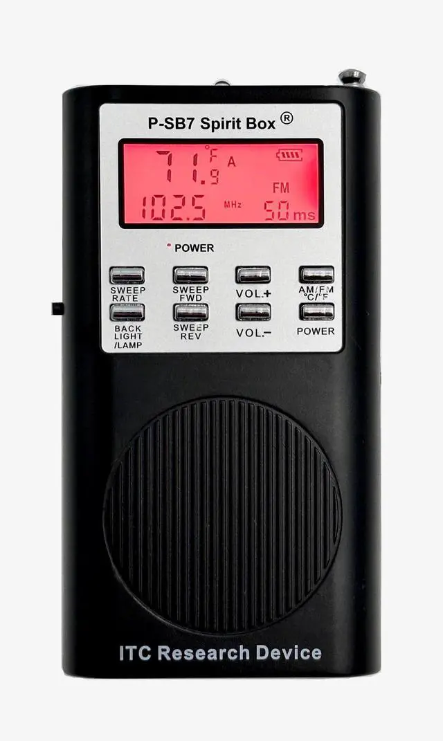 New and improved P-SB7 Spirit Box Rev 8. Now with Bluetooth so you can connect it to a Bluetooth Speaker if you want even better audio. No more cords! This is the 8th revision and latest revision of the "SB7" and was released in November 2025. The Spirit Box still has the ATDD (automatic temperature deviation detection). ATDD is an alert that goes off when the temp changes by +/- 5F. All the other functions are there as well. This version of the SB7 has a half frequency step between each frequency which allows for more and clearer communication to come through.