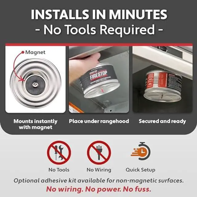 PROTECT YOUR PROPERTY AND LOVED ONES Designed specifically for residential kitchens with four-burner stoves, the Rangehood Fire Suppressor offers essential protection against cooking fires. Tested and approved for grease fires, it automatically activates to quickly suppress flames caused by grease. ^^ EASY TO INSTALL & AUTOMATICALLY ACTIVATED Installs quickly under your range hood with included magnets. When exposed to direct sustained flame contact, it activates automatically, releasing a fire-suppressing agent for fast, effective protection. ^^ TARGETED KITCHEN FIRE PROTECTION Built for residential stovetops, this automatic fire suppressor responds to cooking fires, releasing a fire-suppressing dry-powder for fast, reliable protection right where its needed most.