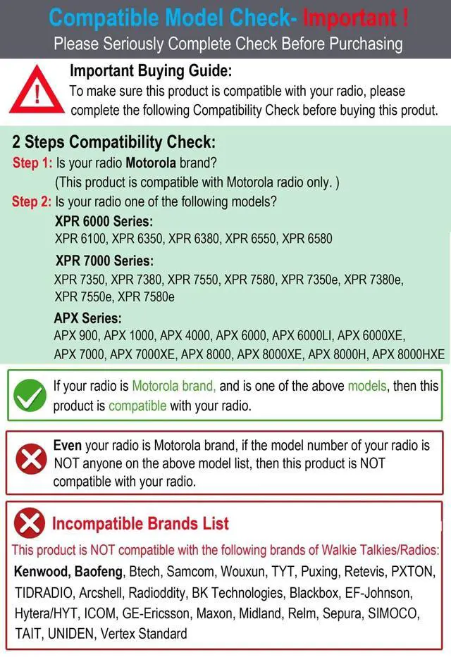 Warranty & Compatibility: 12 months worry-free warranty; Compatible with Motorola APX XPR 6000 XPR 7000 SRX series radios; Including APX 900, APX 1000, APX 4000, APX 6000, APX 6000LI, APX 6000XE, APX 7000, APX 7000XE, APX 8000, APX 8000XE, APX 8000H, APX 8000HXE, XPR 6100, XPR 6300, XPR 6350, XPR 6380, XPR 6500, XPR 6550, XPR 6580, XPR 7300, XPR 7350, XPR 7380, XPR 7550, XPR 7580, XPR 7350e, XPR 7380e, XPR 7550e, XPR 7580e, SRX 2200 and more. ^^