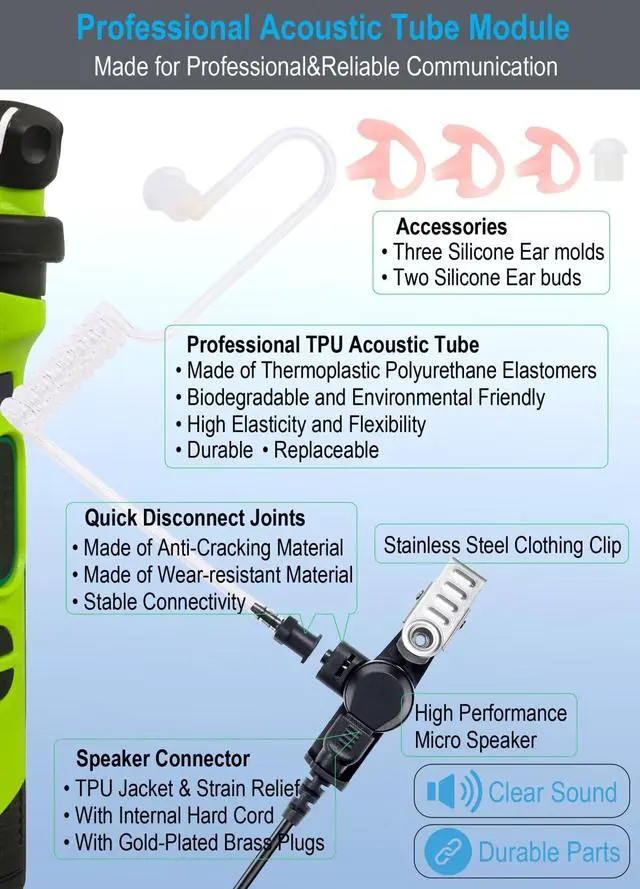 Professional Acoustic Tube Module: Super quality TPU acoustic tube provide durability and flexibility; Ear-hook and elastic coil made by precise forming technology makes your wearing more comfortable; Acoustic tube joints made of anti-cracking & wear-resistant plastic bring reliability and prevent scratching; High performance micro speaker and acoustic tube ensure sound to be transmitted clearly even in loud environment; A variety of accessories meet different ear wearing choice.