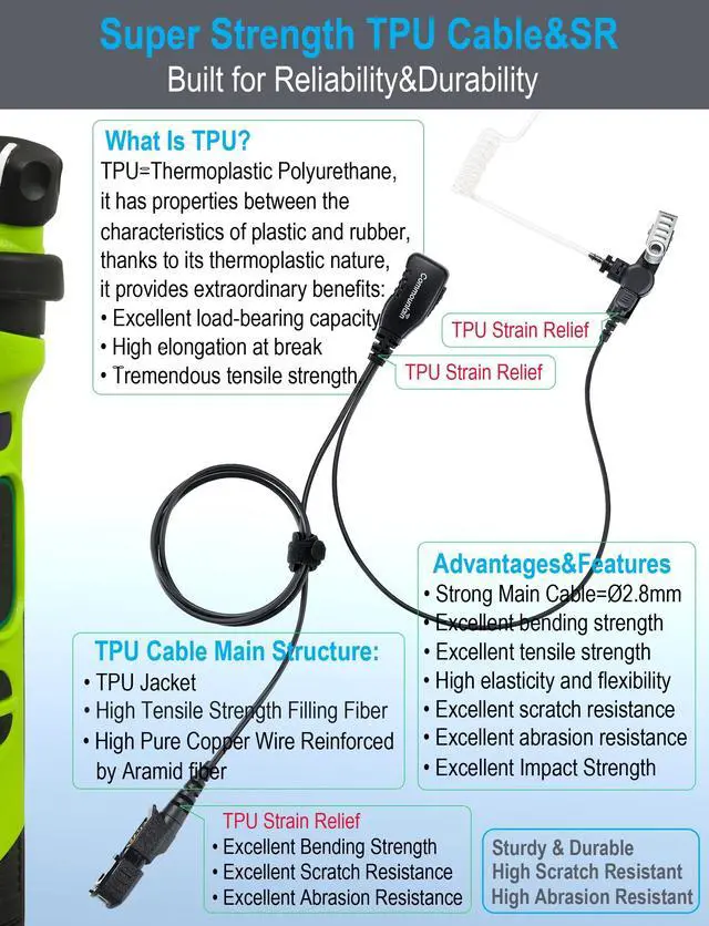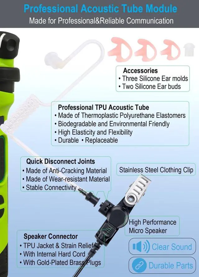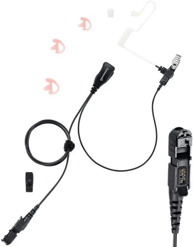 Commountain Single Wire Surveillance Earpiece/Headset KitFeatures: -Single Wire Surveillance kit with Quick-Disconnect Acoustic Tube-Surgical Grade UV Resistant Acoustic Tube, Comfortable & Durable-TPU cable Reinforced by Kevlar Fiber, High Strength & Durability-High Quality Speaker & Microphone Enable Sound to Be Transmitted Clearly Even in Loud Environment-Rugged PTT/Mic with High Feedback PTT Switch&Stainless Steel Swivel Clothing Clip-Rugged ConnectorDimension Specification: -Dimension of
