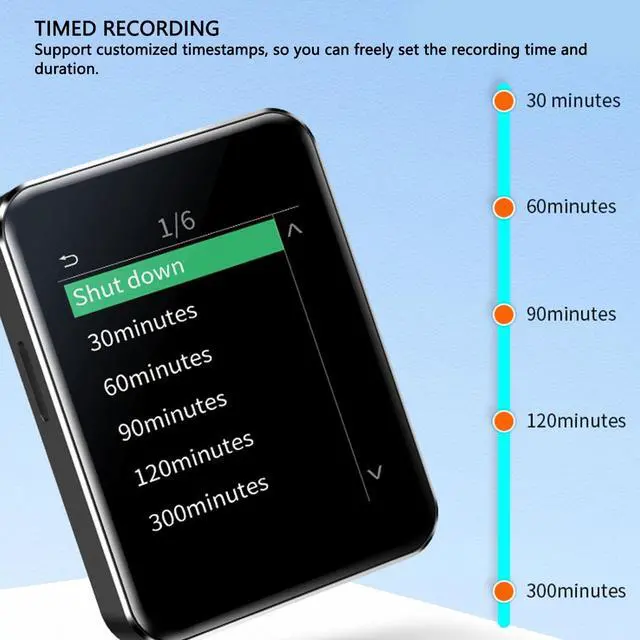 ^^ TIMED RECORDING: It supports timed recording and customized time stamp function. Users can set the recording time and duration. When the set time is reached, the recorder will start recording automatically.