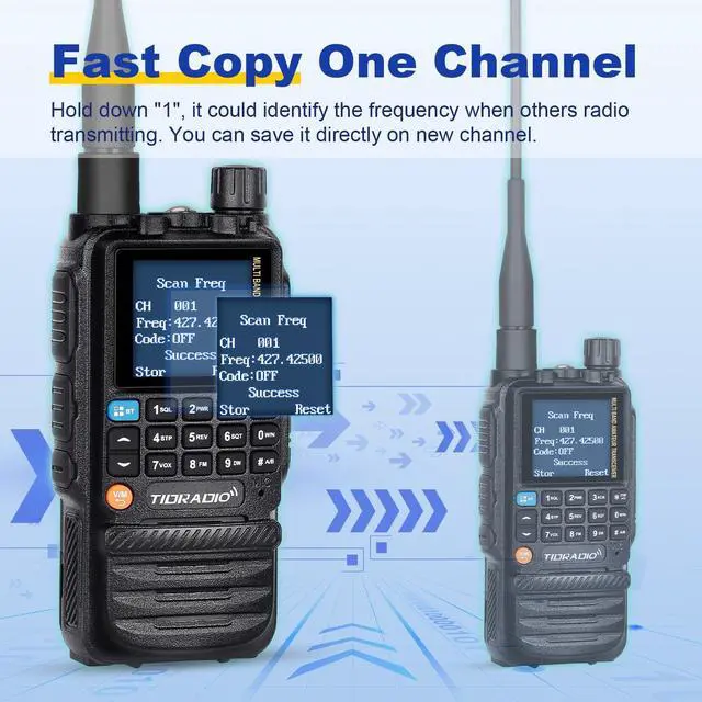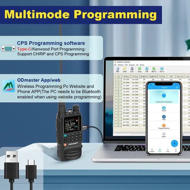 '' > ' ' > > '' > '' > or '@.. ^^ Multi-mode Programming The first walkie-talkie with innovative support for USB C cable programming. H3 support bluetooth programming on phone (APP) and PC (Odmaster Website). 2 pin traditional programming interface, both innovative and conservative. H3 radio supports CHIRP and CPS programming software. We'll keep updating it with more features. ^^ One Key Frequency MatchHold down "1", it can identify the frequency when others radio transmitting. You can save it directly on a new channel. (Menu 47 On/Off) ^^ Multi-Band Transmitting & ReceivingPowerful technology makes TD H3 radio support 8 bands frequencies, including FM/AM (aviation band receiving).