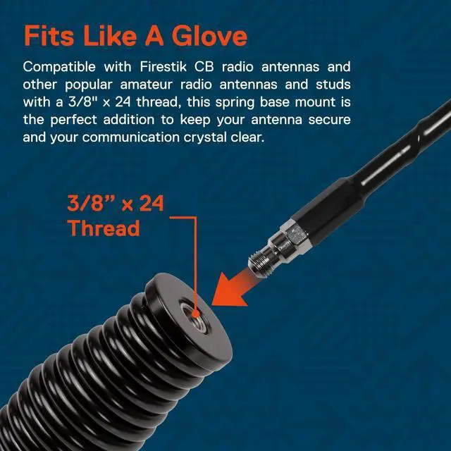 • FITS LIKE A GLOVE - Compatible with Firestik CB radio antennas and other popular amateur radio antennas and studs with a 3/8" x 24 thread. Verified for consistent continuity and clean power delivery between the mounting stud and antenna, this spring base mount is the perfect addition to keep your antenna secure and your communication crystal clear.