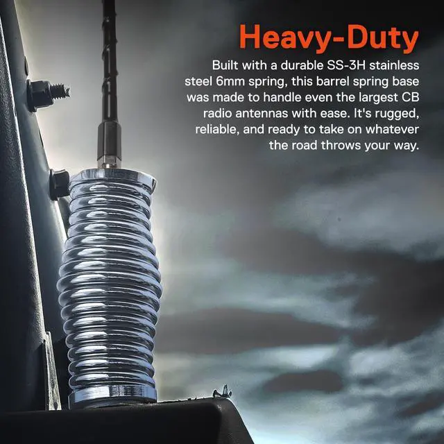 ^^ SMOOTH OPERATOR - Low-hanging branches aren't the only threat to your gear - vibration stress can lead to failures over time. Avoid having to replace your ham radio antenna prematurely with a 3/8 inch x 24 thread spring mount designed to absorb shocks from whoops, bumps, hard corners and washboard roads. ^^ HEAVY-DUTY - Built with a durable SS-3H stainless steel 6mm spring, this barrel spring base was made to handle even the largest CB radio antennas with ease. It's rugged, reliable, and ready to take on whatever the road throws your way.