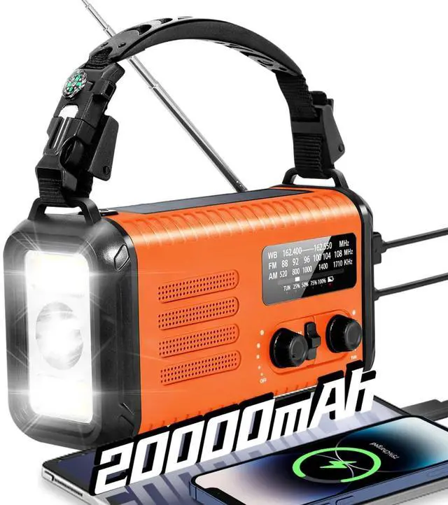 Emergency Crank Radio, 20000mAh / 74000mWh Solar Hand Crank Weather Radio with NOAA/AM/FM, Battery Powered Radio with Cell Phone Charger, Reading Lamp, Flashlight & SOS for Emergencies/Home (Orange)