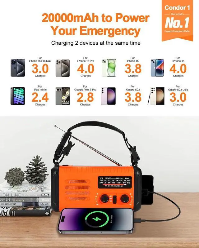 LARGEST BATTERY CAPACITY - iRonsnow Condor 1, The world's No. 1 capacity emergency radio 20000mAh, The large battery capacity can charge multiple mobile devices and also supports charging 2 devices at the same time. When a crisis strikes, it can even help the entire family avoid the risk of power outage. ^^ NOAA WEATHER RADIO - As the global climate continues to worsen, we increasingly need more powerful life-saving radios. This noaa weather radio comes with clear sound from 7 NOAA stations to receive the latest weather and all hazard information for your area, such as hurricanes, tornadoes, and more.