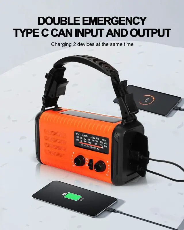 • UPGRADED USB C INTERFACE - The solar hand crank radio with bidirectional USB C interface, can input power for the radio, and also output power for devices. The radio's crank lever and solar panel are both capable of regenerating enough power to keep the 20000mAh(74000mWh) rechargeabl