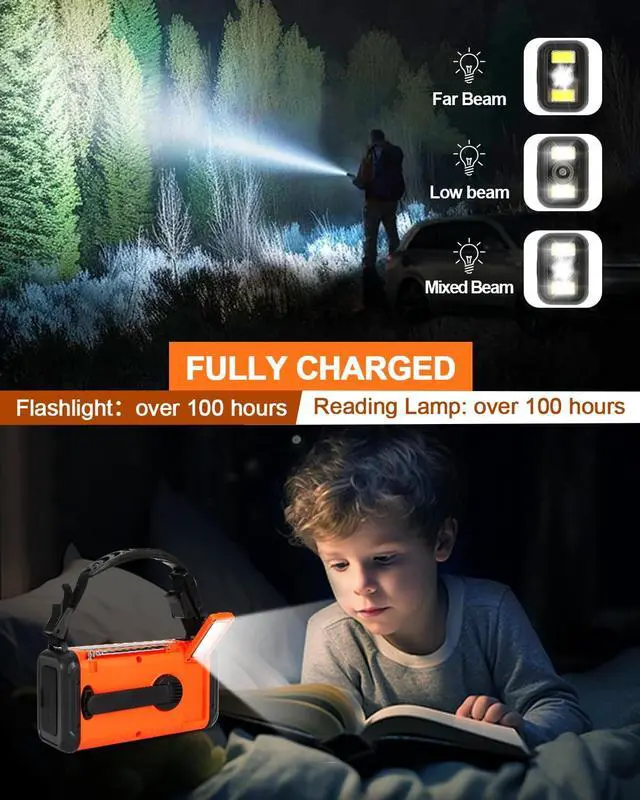 It also has FM AM traditional channels, which is both an emergency device and a home entertainment tool. ^^ UPGRADED USB C INTERFACE - The solar hand crank radio with bidirectional USB C interface, can input power for the radio, and also output power for devices. The radio's crank lever and solar panel are both capable of regenerating enough power to keep the 20000mAh (74000mWh) rechargeable battery, radio, lights, and SOS alarm ready to go when you need it most. ^^ REAL READING LAMP & 4 MODE FLASHLIGHT - In order to provide better comfort to our eyes, we have completely reformed the angle and position of the light.