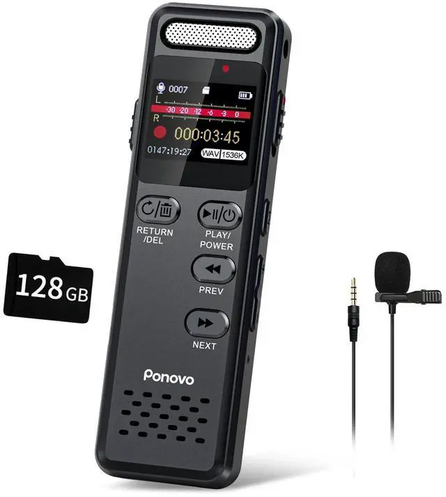 Multi-Functional: A-B Repeat & Voice Activated Recorder Our digital recorder is powerful and versatile, featuring an "A-B repeat" function that allows for repeated playback of important content, enhancing comprehension of meeting details or language learning. Additionally, with a 6-digit password setting, only you can access the device, ensuring your recordings is protected. Other features such as voice activation, timer recording, MP3 and line-in recording are waiting for you to explore ^^ 2-Year Warranty & 24-Hour Customer SupportYour satisfaction is our unremitting goal! Ponovo audio recorders with microphone provide a 2-year warranty for all users. Please read the included instructions before use. If you encounter any problems during use, please tell us and our team will give you a instant answer within 24 hours. Pack include1*160GB Digital Voice Recorder, 1* 3.5 mm External Microphone, 1* 3.5 mm Line-in Cable, 1*USB-C Cable, 1*Lanyard, 1*Manual and Quick Help