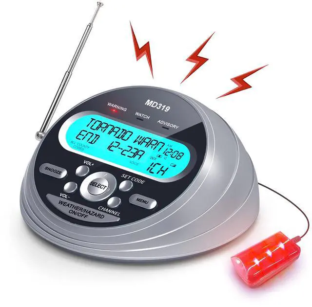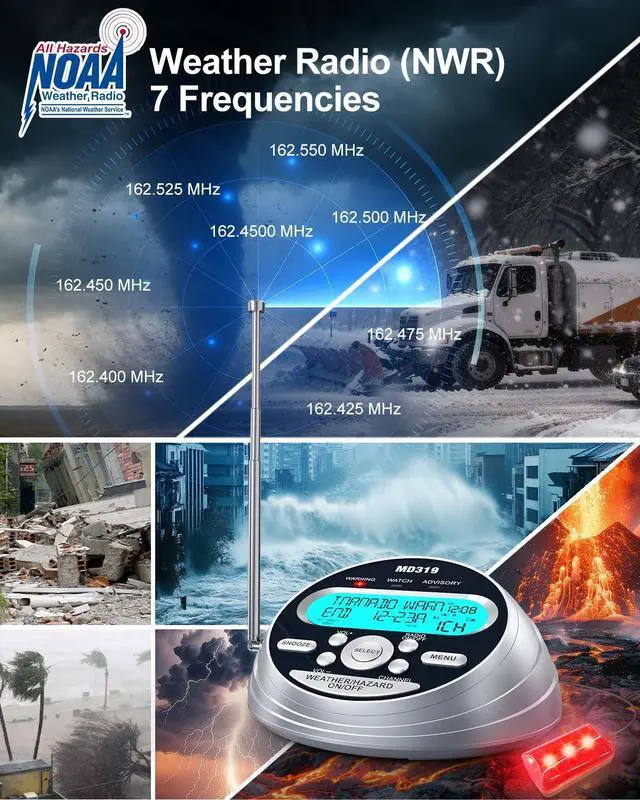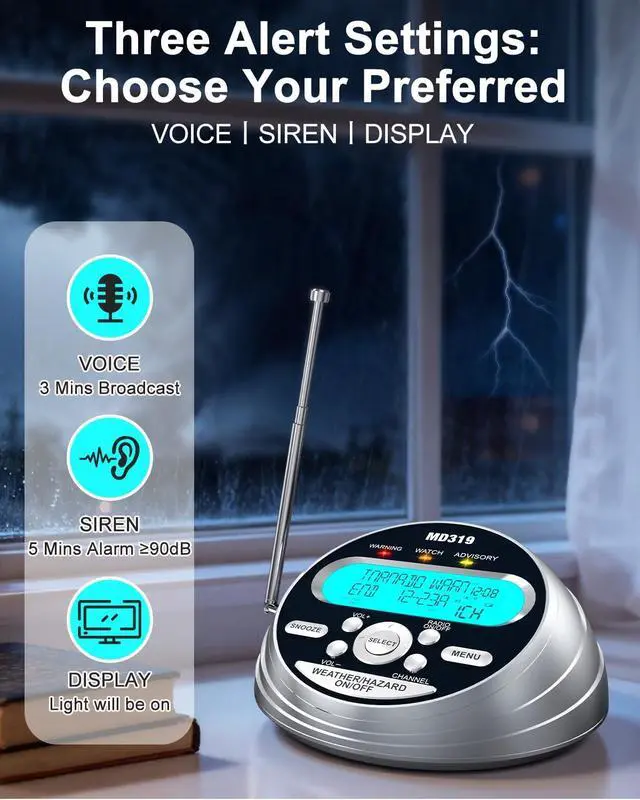 ^^ 3 Alert Settings: VOICE/SIREN/DISPLAY NOAA Weather Alert Radio features VOICE, SIREN, and LIGHT DISPLAY alert modes. Whether youre at home, or in noise-sensitive spaces, stay protected 24/7 with precision alerts. Stay informed with clear voice broadcasts delivering 90-second real-time updates, a loud 90+ dB siren with urgent 5-minute warnings, or silent LED visual alerts color-coded for Watch, Warning, and Advisory levels. Stay informed about critical weather emergencies! ^^ Integrated Digital Clock & Alarm System NOAA Weather Alert Radio integrates a digital clock and alarm clock, clearly displaying the current time in 12-hour format alongside the date. Its smart alarm system puts you in command, enhanced by a convenient single-touch snooze functiona quick press delays the alarm for 9 minutes of extra rest, repeatedly if needed. The clear electronic display is further complemented with an backlight setting, ensuring effortless readability in all. ^^ Dual Power Protection for Uninterrupted Safety Be prepared for the unexpected with this NOAA Weather Alert Radio, which receives official emergency alerts directly from NOAA, including critical warnings for tornadoes, hurricanes, blizzards, and more. The weather alert radio operates on both 110V AC power and 4 AA battery backup (not included), delivering over 72 hours of continuous operation during outages.