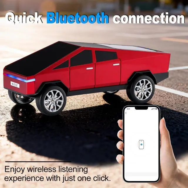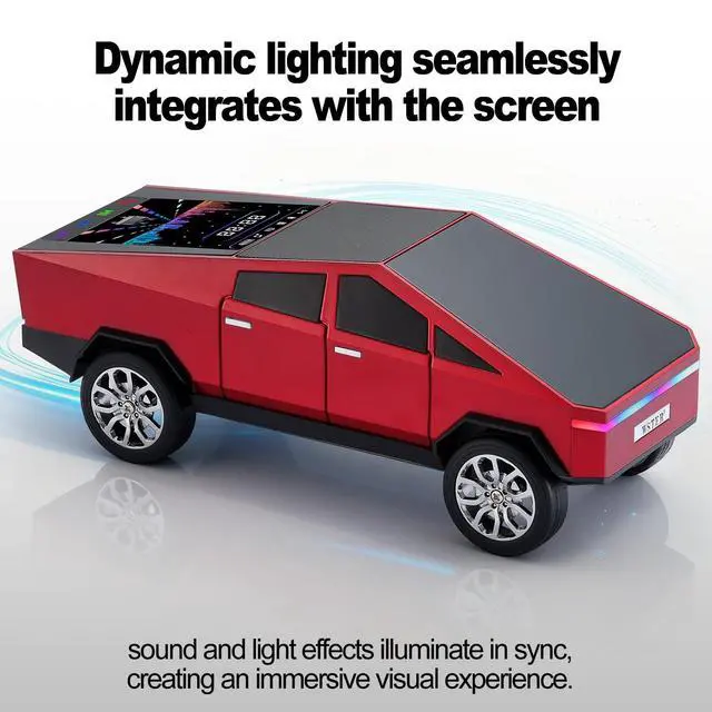 Pickup Truck Style Construction Model-inspired body with defined lines and rolling wheels. ^^ LED Display Screen Information Shows playback mode and connection status clearly. ^^ Multiple Audio Input Options Bluetooth streaming, USB drive, TF card and FM radio. ^^ TWS Wireless Stereo Support Pair two units for left-right channel output. ^^ Built-in Microphone & Type-C Charging Hands-free calls and modern charging connection.