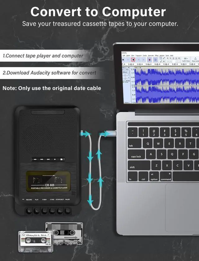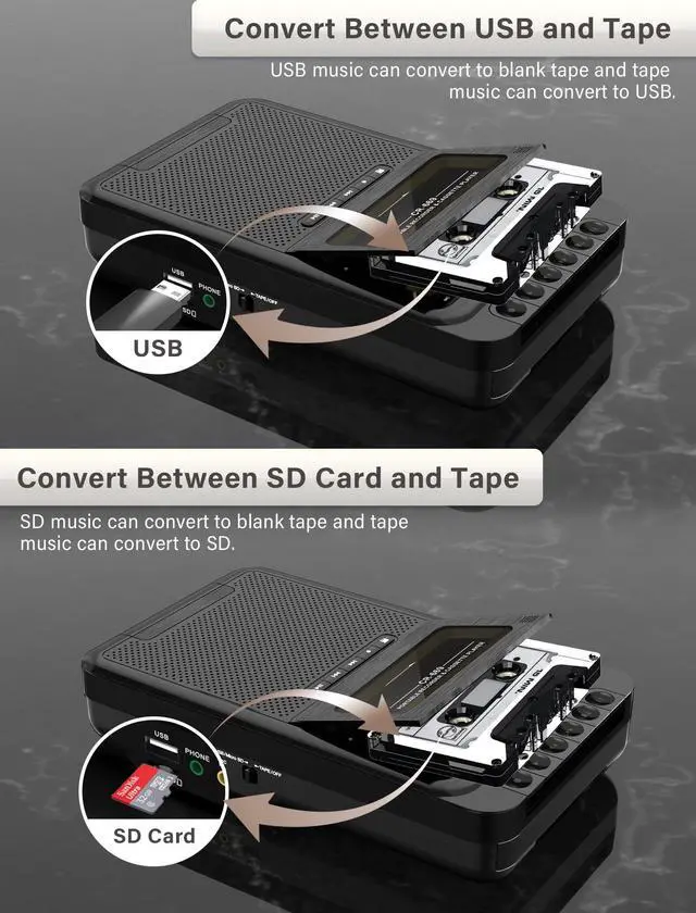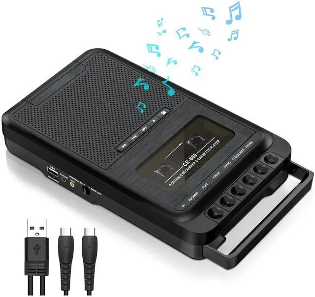 Multi-function Tape PlayerIf you're looking for a multi-functional cassette player recorder, then this one is definitely suitable for your needs. Not only can it play cassette tapes, but it can also play USB drive and TF card. In addition, recording, transcription, and stereo sound quality are the shining points of this portable cassette player. This cassette tape player is designed with a retractable handle, making it easy to move and carry. ^^ 2 Power Supply and 3.5 mm Earphone JackThis portable tape cassette player supports two power options: using 4 C size batteries or using a Type-C power cable (Included). The cassette player offers flexible power options for all situations, whether on the go or at home. The cassette player features a high-quality 3.5 mm headphone jack, ensuring crystal-clear sound playback of your favorite cassette tapes. Allowing us to enjoy our own private music space by simply plugging in a 3.5 mm headphone. ^^ Recording and 3 Play ModesThis cassette tape player has three playing modes: tape playing, U disk& TF card playing, which meets your needs to play music at different times. With the built-in HD microphones we can record to tape or U disk/TF card, it also supports connecting an external microphone, whether you are recording a cozy conversation, preserving the soothing sounds of nature, or conducting an improvised interview, this tape player recorder will provide you with clear audio. ^^ Multiple Conversion ModesThis is a multifunctional cassette converter. It can record the content of cassette tapes and save them into a USB flash drive or TF card. Alternatively, it can record music saved on a USB flash drive/TF card into cassette tapes. Moreover, we can use the software Audacity to transfer cassette tape music into a computer. With so many conversion functions, we can operate according to different needs. ^^ Excellent Sound and Customer ServiceThis cassette tape player is equipped with a 3W speaker, a 4 subwoofer soundstage, which well reproduces the tape sound quality and provides an authentic high-quality music atmosphere. Take this multifunctional tape player home now, it's definitely the best choice! More, your satisfaction is our motivation.