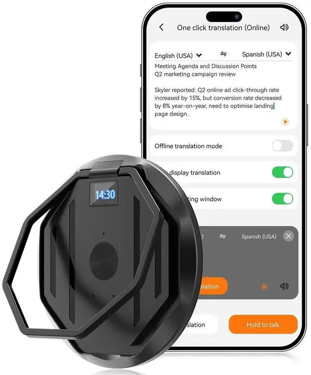 Language Barriers Instantly: Elbourn AI Translator supports translation of 152 languages, recognises 146 different languages, covers 200 regions, supports offline translation in 13 countries including China, UK, Japan and Korea, and can still work without network, and provides instant response for asking for directions, ordering food, and business negotiation when you go abroad. ^^ Not Only Recording Device Our smart translation recorder uses the most advanced natural translation technology to recognize your voice, intelligently break it down, and translate it instantly. No awkward pauses, just smooth and natural communication. We can provide you with fluent translation in any occasion and solve communication problems efficiently. ^^ Simultaneous Interpretation + Meeting RecordingSupport AB face-to-face translation mode, meeting scenarios, long recordings can be synchronized to text minutes, and export mind maps after the meeting. 3 times faster than manual recording, especially suitable for multinational team brainstorming or academic interviews. ^^ Dual Translation for Photo/Audio Recording, all-around Learning and TravelingCan't read the menu or manual? Use photo translator to focus on the text and output the target language immediately. Students can record the classroom content and listen to the key passages again and again at home.