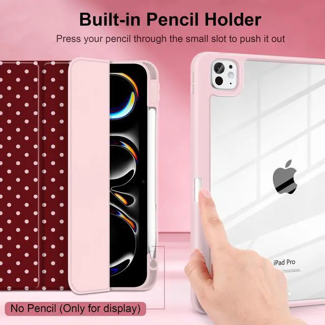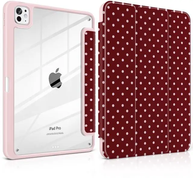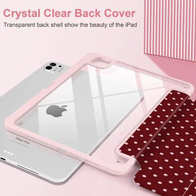 TWOLSKOO Case for iPad Pro 11-inch (M5 2025 / M4 2024), Clear Acrylic Back with TPU Bumper, Pencil Holder, Trifold Stand, Auto Sleep/Wake, Red Polka Dot