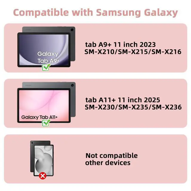 Attention CompatibilityThis bluetooth tablet keyboard case is Only compatible for Samsung Galaxy Tab 11+ 11" 2025 (SM-X230/SM-X235/SM-X236), Tab A9+ 11" 2023 (SM-X210/SM-X215/SM-X216). It will NOT work for any other model device, please you carefully check before buying it. ^^ Magnetic Removable KeyboardThis Samsung Tab A9 plus case and keyboard are magnetically attached so the keyboard can be removed at any time and the case can be used on its own. Ideal for business trips, traveling and studying on the go. ^^ All-Day ProtectionDurable PU leather cover and anti-slip rubber-lined interior provide full protection for your tablet, greatly reduces the damage to your tablet caused by collisions.