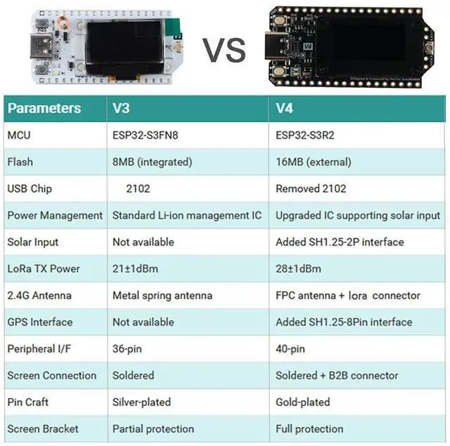 Compared with LoRa32 V3, LoRa 32 V4 features comprehensive improvements in craftsmanship and enhanced performance. ^^ This LoRa V4 board comes unassembled, then soldering is required. ^^ When you use lora32 v4 development board, you need to use 2pcs together, one receiving and another sending. ^^ You will receive, 1pcs esp32 lora V4, 1pcs 915mhz lora antenna, and 1pcs 2pin 1.25 mm connector, not equipped with Li BAT, gps or other accessories. ^^ It is possible to provide the datasheet if you check the sixth picture.