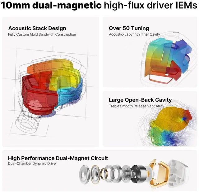 Dual-Magnet Dual-Chamber DD for Accurate MonitoringTears is a wired in-ear monitor (IEM) built with a dual-magnet dual-chamber dynamic driver, delivering fast transients, controlled bass, and precise imaging for reliable IEM ear monitors and critical listening. ^^ Open-Back Acoustic Labyrinth SoundstageThe open-back acoustic labyrinth improves airflow and reduces resonance, creating a wider, more natural soundstage than typical sealed wired earbuds or in ear headphones, with clear separation and spatial depth. ^^ Balanced Tuning with Smooth Treble & Deep BassPrecisely tuned for a neutral-natural signature, these wired IEMs offer punchy yet relaxed bass, clean mids, and smooth treble, suitable for long sessions with in ear monitor earphones.