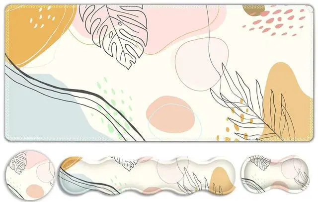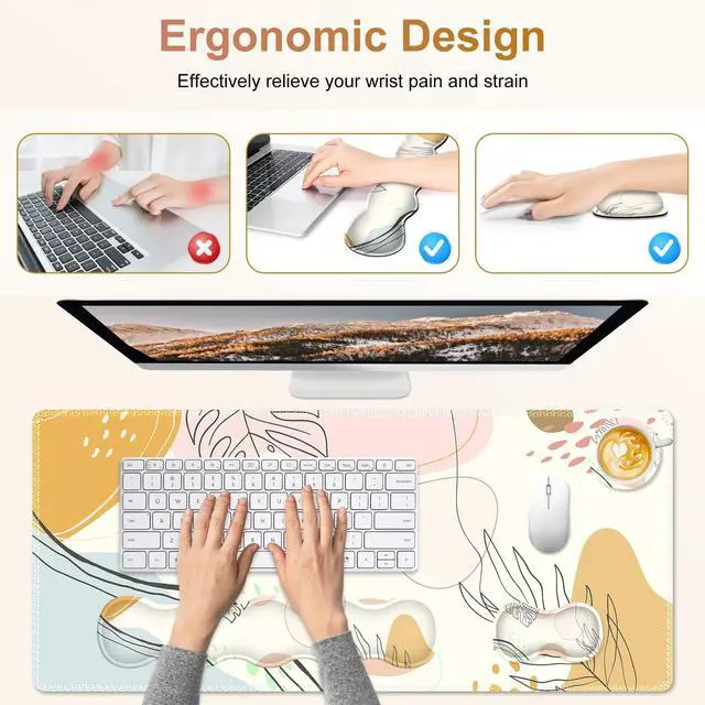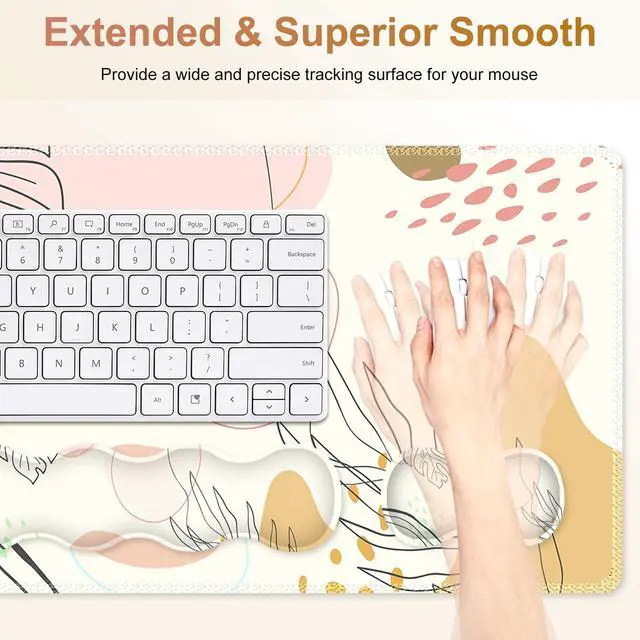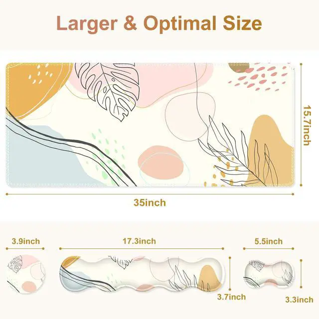 35.4 x 15.7 Inches Desk Pad Mat The office mousepad is large enough to accommodate your laptop, mouse, keyboard, computer accessory, notebook and drinks, its a great desk accessories to keep your desk clean and tidy. The mouse and keyboard pad Will energetic your work ^^ Memory Foam Wrist SupportThe curved shape of the wrist rest set filled with memory foam fits perfectly on the wrist. When using the keyboard or mouse, the desk matt for desktop provided the appropriate height of the wrist, keeping your wrist in a natural and comfortable state to relieve the pressure, fatigue and pain from work or study ^^ 4MM Non-slip Computer Keyboard MatThe non-slip base made of natural rubber is a nice touch with 4mm thickness, providing a heavy grip on the desk, keeping the keyboard and mouse pad from sliding or moving easily ^^ Water-resistant Coating This durable desk mouse mat made of a spill-proof coating is easy to clean with a damp cloth, keeping your desk from scratches, stains, spills, heat and abrasion.