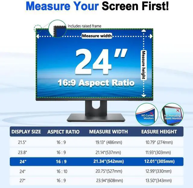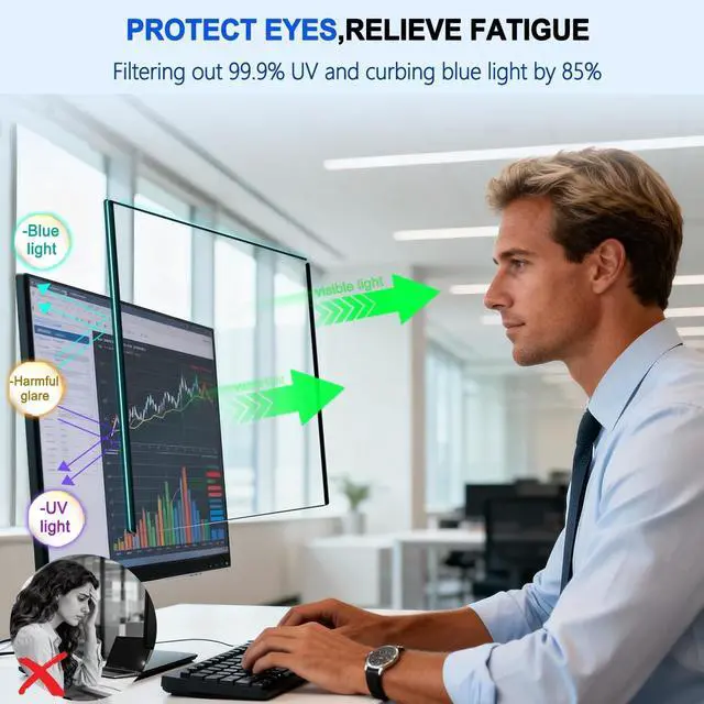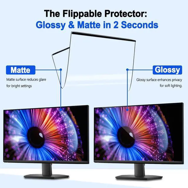Note: Measurements include bezel dimensions. Not compatible with curved monitors or displays with prominently raised bezels. Innovative all-magnetic design ensures quick, secure, and gap-free attachment in seconds. ^^ Dual-Side Use & Blue Light Blocking & Anti-Glare MatteFlip the screen protector to match your environment! The matte side delivers superior anti-glare performance while blocking harmful blue light, effectively eliminating reflections and reducing eye strainoutperforming ordinary screen films. The crystal clear side preserves your monitor's original color vividness and clarity while still offering essential blue light filtering. Two professional viewing modes in one, adapt instantly to your visual needs and lighting conditions. ^^ Blue Light Filtering & All-Day Eye ComfortGo beyond privacy with enhanced eye care. This filter blocks up to 95% of harmful blue light while significantly reducing glare. Enjoy comfortable viewing during long work sessions, with minimized digital eye strain, dryness, and fatigue. ^^ Crystal Clear, True