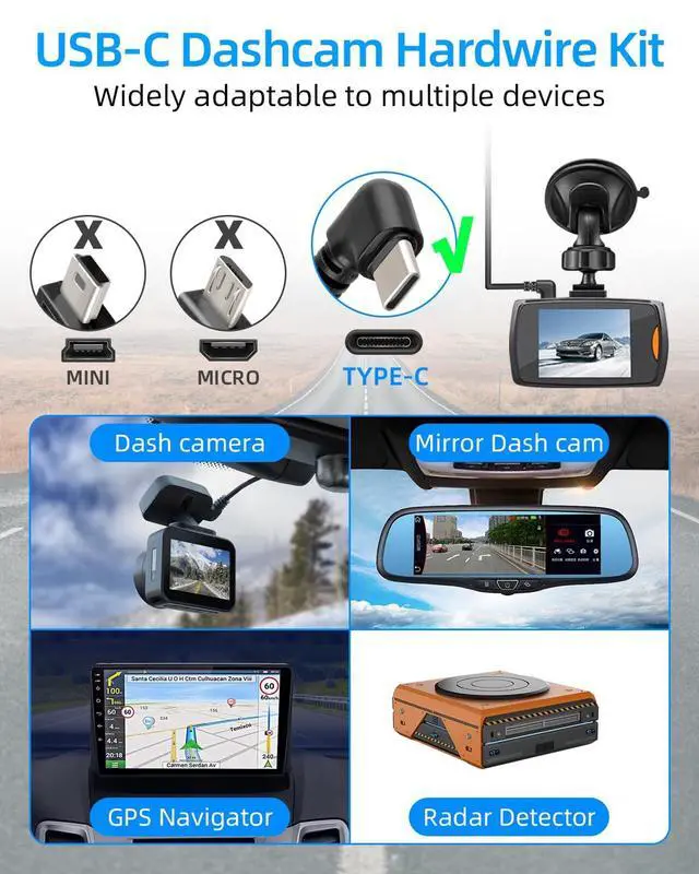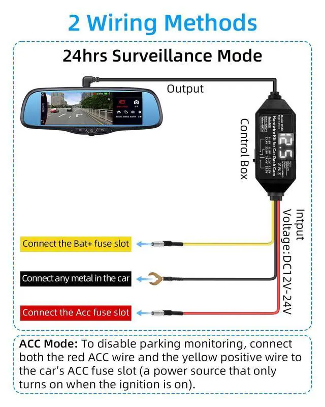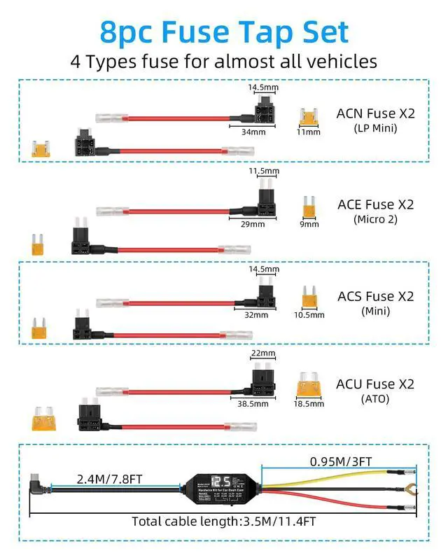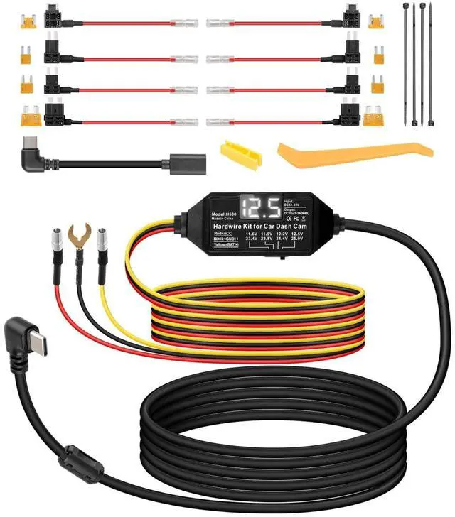 car voltage protection regulation: 24.4 - 23.6V. When the voltage drops below the cut-off voltage, the power will automatically be cut off to prevent the battery from running out of control, making it compatible with 12V/24V dual-system vehicles. ^^ [Widely Compatible Kit] Comes with 4 types of fuse adapters for Low-Profile Mini x2, Mini x2, ATO (normal) x2, and Micro2 x2, with tie wraps, pry bar, ACC adapter short cable, wire clips and instructions, the leads come with a protective sleeve to cover the crimp. No additional adapter fittings are required, and it fits almost all cars/trucks/buses/RVs. ^^ [24/7 Intelligent Parking] Hardwired connection (yellow & red wires to ACC fuse) intelligently detects your vehicle's ignition status and automatically switches to low-power monitoring mode after stopping. Connect the car power supply to get an uninterrupted power supply, support 24/7 dynamic monitoring and parking monitoring, and protect your vehicle. ^^ [Quick and TIDY] 3.5 -metre extended flame retardant bend-resistant cable, the plug-and-play design allows for installation in minutesseamless installation without the need for specialized tools and long enough to fit windscreens of all sizes, perfect for DIY installations.