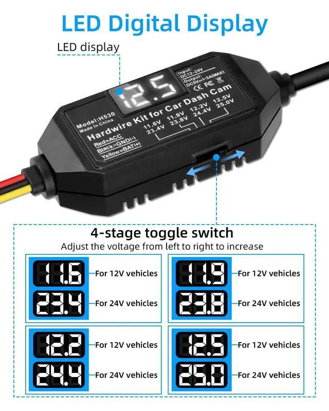 The Car Step-down Cable Hardwire Kit for Dashboard Cam C models comes with an LED digital display that shows battery voltage and sets low voltage protection, monitors the battery to see if it is functioning properly, and connects to the car's power supply, which protects the car's battery and is perfect for monitoring your car for damage. ^^ [4-Position Adjustable Switch] By toggle switch, you can switch 12V and 24V protection regulation mode, 12V