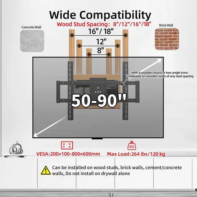 Wide Compatible: The Universal TV Wall Mount is specially designed to fit almost flat and curved 50-90" TVs up to 264 LBS, This Rotating TV mount fits TV screen sizes 50, 52, 55, 60, 65, 70, 75, 80, 82, 85, 86, 90 inches etc, with VESA patterns 200x100 to 800x600mm, VESA = W x L, VESA Patterns include200x100mm 200x200mm 300x200mm 300x300mm 400x200mm 400x300mm 400x400mm 500x400mm 500x500mm 600x200mm 600x400mm 600x500mm 600x600mm 700x400mm 700x450mm 700x500mm 800x400mm 800x600mm etc ^^